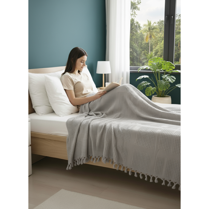 - Kare waffle deseniyle modern ve şık bir görünüm kazandırarak yatak odanızın dekorasyonuna estetik bir dokunuş ekler.