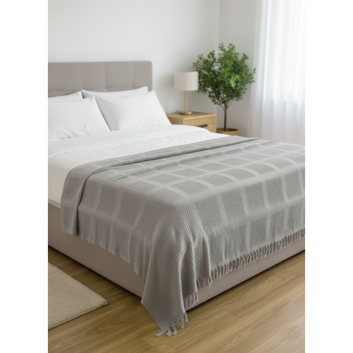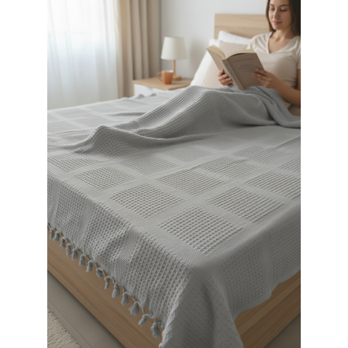 %100 Pamuk Çift Kişilik Pike , Püsküllü Yatak Örtüsü Kare Waffle Desen 220x240