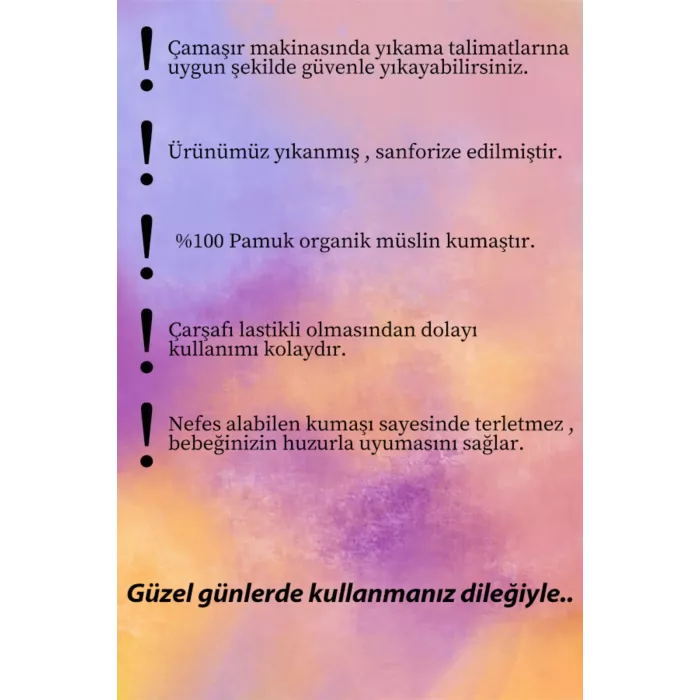 - %100 organik pamuk materyali ile bebeğinizin cildine zarar vermeden yumuşak bir dokunuş sunar.